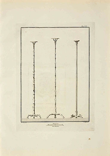 Ancient Roman Tripods from the series "Antiquities of Herculaneum", is an original etching on paper realized by Giuseppe Aloja in the 18th Century. Signed on the plate. Good conditions with a small cut on the lower. The etching belongs to the print suite “Antiquities of Herculaneum Exposed” (original title: “Le Antichità di Ercolano Esposte”), an eight-volume volume of engravings of the finds from the excavation of the ruins of Herculaneum in the Kingdom of Naples (now Campania, Italy). It was published between 1757 and 1792 by the Regia Stamperia, and copies were delivered to selected recipients across Europe. Despite the title, the Antiquity of Herculaneum shows objects from all the excavations undertaken by the Bourbons in the Gulf of Naples. These include Pompeii, Stabia and two sites of Herculaneum: Resina and Portici. The Bourbon King Carlo appointed fifteen scholars creating a new “Herculaneum Academy” to study the artifacts and publish the results of the archaeological excavations of the sites.The engravings are of high quality and the accompanying text shows a large scholarship. They were realized by 25 prominent artists involved by the King to prepare drawings and engravings on the finds, among which we can find Giovanni Elia Morghen, Carlo Nolli, Luigi Vanvitelli and Giovanni Battista Casanova.The “Antiquities” was designed more to amaze readers with the quality of the objects in the collection of the King of Naples than to be used in research., following and increasing the interest of 18th century society for the classical culture and Art in particular.Through the exaltation of the classical concept of proportions and harmony, the book was of inspiration to the neoclassical movement in Europe, giving artists and decorators access to a huge shop of Hellenistic motifs. Ref.: National Gallery (Washington), Mark J. Millard Architectural, IV (2000), no. 1; L. Garcia y Garcia, Nova bibliotheca pompeiana (2 v., 1998); Royal Institute of British Architects, British Architectural Library ... Early printed books, 1 (1994), no. 112. U. Pannuti, 'Incisori e disegnatori della Stamperia Reale di Napoli nel secolo XVIII: la pubblicazione delle Antichità di Ercolano', in Xenia antiqua, 9 (2000), p. 151-178; V. Trombetta, 'L'edizione de Le Antichità di Ercolano esposte' in Rendiconti dell'Accademia di Archeologia, lettere e belle arti di Napoli , 59 (1984), p.151-172.