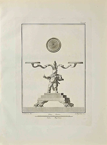Ancient Roman Statues from the series "Antiquities of Herculaneum", is an original etching on paper realized by Casanova in the 18th Century. Signed on the plate. Good conditions except for some folding. The etching belongs to the print suite “Antiquities of Herculaneum Exposed” (original title: “Le Antichità di Ercolano Esposte”), an eight-volume volume of engravings of the finds from the excavation of the ruins of Herculaneum in the Kingdom of Naples (now Campania, Italy). It was published between 1757 and 1792 by the Regia Stamperia, and copies were delivered to selected recipients across Europe. Despite the title, the Antiquity of Herculaneum shows objects from all the excavations undertaken by the Bourbons in the Gulf of Naples. These include Pompeii, Stabia and two sites of Herculaneum: Resina and Portici. The Bourbon King Carlo appointed fifteen scholars creating a new “Herculaneum Academy” to study the artifacts and publish the results of the archaeological excavations of the sites.The engravings are of high quality and the accompanying text shows a large scholarship. They were realized by 25 prominent artists involved by the King to prepare drawings and engravings on the finds, among which we can find Giovanni Elia Morghen, Carlo Nolli, Luigi Vanvitelli and Giovanni Battista Casanova.The “Antiquities” was designed more to amaze readers with the quality of the objects in the collection of the King of Naples than to be used in research., following and increasing the interest of 18th century society for the classical culture and Art in particular.Through the exaltation of the classical concept of proportions and harmony, the book was of inspiration to the neoclassical movement in Europe, giving artists and decorators access to a huge shop of Hellenistic motifs. Ref.: National Gallery (Washington), Mark J. Millard Architectural, IV (2000), no. 1; L. Garcia y Garcia, Nova bibliotheca pompeiana (2 v., 1998); Royal Institute of British Architects, British Architectural Library ... Early printed books, 1 (1994), no. 112. U. Pannuti, 'Incisori e disegnatori della Stamperia Reale di Napoli nel secolo XVIII: la pubblicazione delle Antichità di Ercolano', in Xenia antiqua, 9 (2000), p. 151-178; V. Trombetta, 'L'edizione de Le Antichità di Ercolano esposte' in Rendiconti dell'Accademia di Archeologia, lettere e belle arti di Napoli , 59 (1984), p.151-172.