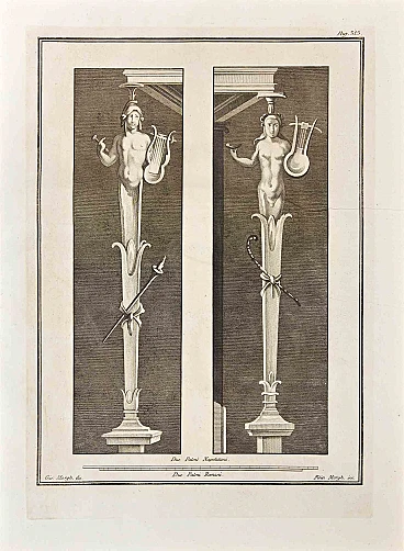 Ancient Roman Statues from the series "Antiquities of Herculaneum", is an original etching on paper realized by Giovanni Morghen in the 18th Century. Signed on the plate. Good conditions except for some minor stains and a cutting on the part. The etching belongs to the print suite “Antiquities of Herculaneum Exposed” (original title: “Le Antichità di Ercolano Esposte”), an eight-volume volume of engravings of the finds from the excavation of the ruins of Herculaneum in the Kingdom of Naples (now Campania, Italy). It was published between 1757 and 1792 by the Regia Stamperia, and copies were delivered to selected recipients across Europe. Despite the title, the Antiquity of Herculaneum shows objects from all the excavations undertaken by the Bourbons in the Gulf of Naples. These include Pompeii, Stabia and two sites of Herculaneum: Resina and Portici. The Bourbon King Carlo appointed fifteen scholars creating a new “Herculaneum Academy” to study the artifacts and publish the results of the archaeological excavations of the sites.The engravings are of high quality and the accompanying text shows a large scholarship. They were realized by 25 prominent artists involved by the King to prepare drawings and engravings on the finds, among which we can find Giovanni Elia Morghen, Carlo Nolli, Luigi Vanvitelli and Giovanni Battista Casanova.The “Antiquities” was designed more to amaze readers with the quality of the objects in the collection of the King of Naples than to be used in research., following and increasing the interest of 18th century society for the classical culture and Art in particular.Through the exaltation of the classical concept of proportions and harmony, the book was of inspiration to the neoclassical movement in Europe, giving artists and decorators access to a huge shop of Hellenistic motifs. Ref.: National Gallery (Washington), Mark J. Millard Architectural, IV (2000), no. 1; L. Garcia y Garcia, Nova bibliotheca pompeiana (2 v., 1998); Royal Institute of British Architects, British Architectural Library ... Early printed books, 1 (1994), no. 112. U. Pannuti, 'Incisori e disegnatori della Stamperia Reale di Napoli nel secolo XVIII: la pubblicazione delle Antichità di Ercolano', in Xenia antiqua, 9 (2000), p. 151-178; V. Trombetta, 'L'edizione de Le Antichità di Ercolano esposte' in Rendiconti dell'Accademia di Archeologia, lettere e belle arti di Napoli , 59 (1984), p.151-172.