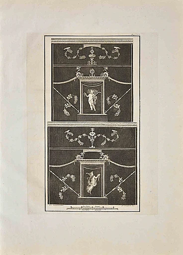 Ancient Roman Fresco from the series "Antiquities of Herculaneum", is an original etching on paper realized by Pietro Campana in the 18th Century. Signed on the plate. Good conditions except for some minor stains and a cutting on the part. The etching belongs to the print suite “Antiquities of Herculaneum Exposed” (original title: “Le Antichità di Ercolano Esposte”), an eight-volume volume of engravings of the finds from the excavation of the ruins of Herculaneum in the Kingdom of Naples (now Campania, Italy). It was published between 1757 and 1792 by the Regia Stamperia, and copies were delivered to selected recipients across Europe. Despite the title, the Antiquity of Herculaneum shows objects from all the excavations undertaken by the Bourbons in the Gulf of Naples. These include Pompeii, Stabia and two sites of Herculaneum: Resina and Portici. The Bourbon King Carlo appointed fifteen scholars creating a new “Herculaneum Academy” to study the artifacts and publish the results of the archaeological excavations of the sites.The engravings are of high quality and the accompanying text shows a large scholarship. They were realized by 25 prominent artists involved by the King to prepare drawings and engravings on the finds, among which we can find Giovanni Elia Morghen, Carlo Nolli, Luigi Vanvitelli and Giovanni Battista Casanova.The “Antiquities” was designed more to amaze readers with the quality of the objects in the collection of the King of Naples than to be used in research., following and increasing the interest of 18th century society for the classical culture and Art in particular.Through the exaltation of the classical concept of proportions and harmony, the book was of inspiration to the neoclassical movement in Europe, giving artists and decorators access to a huge shop of Hellenistic motifs. Ref.: National Gallery (Washington), Mark J. Millard Architectural, IV (2000), no. 1; L. Garcia y Garcia, Nova bibliotheca pompeiana (2 v., 1998); Royal Institute of British Architects, British Architectural Library ... Early printed books, 1 (1994), no. 112. U. Pannuti, 'Incisori e disegnatori della Stamperia Reale di Napoli nel secolo XVIII: la pubblicazione delle Antichità di Ercolano', in Xenia antiqua, 9 (2000), p. 151-178; V. Trombetta, 'L'edizione de Le Antichità di Ercolano esposte' in Rendiconti dell'Accademia di Archeologia, lettere e belle arti di Napoli , 59 (1984), p.151-172.