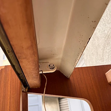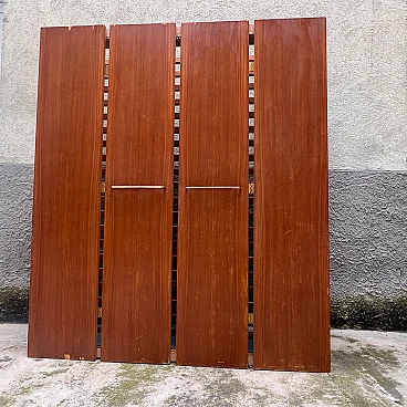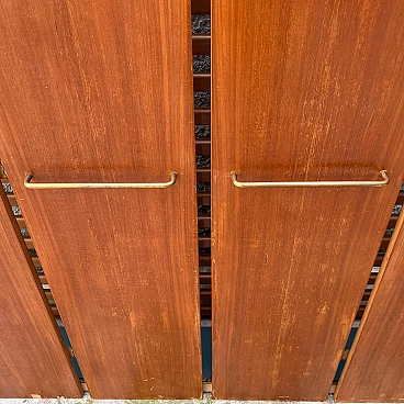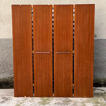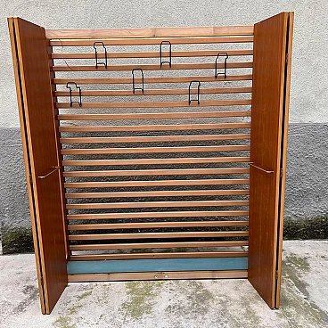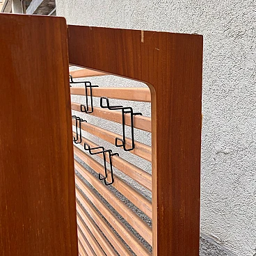 Coat rack with folding doors by Eugenia Alberti Reggio, 1950s. It has a simple but functional structure. It consists of a grid of horizontal wooden slats on which practical black-painted metal hangers can be moved, slid, unhooked and rehooked. Four vertical wooden panels serve as doors that open with a folding system and are equipped with two wide brass handles. This piece won third prize ex aequo in the "La Rinascente Compasso d'Oro" competition in 1955. It is in original condition so needs some minor restoration work to accommodate some chipping to the exterior veneer, as well as polishing. The piece is equipped with an electrical system for neon lighting with a power control when the same is opened but it is recommended to rewire the circuit.