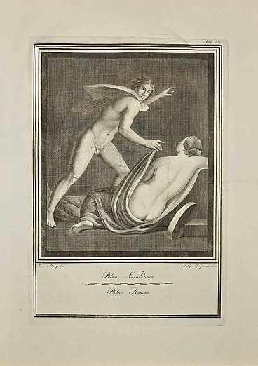 Ancient Roman Fresco from the series "Antiquities of Herculaneum", is an original etching on paper realized by Giovanni Morghen in the 18th Century. Signed on the plate. Good conditions except for some minor stains and a cutting on the part. The etching belongs to the print suite “Antiquities of Herculaneum Exposed” (original title: “Le Antichità di Ercolano Esposte”), an eight-volume volume of engravings of the finds from the excavation of the ruins of Herculaneum in the Kingdom of Naples (now Campania, Italy). It was published between 1757 and 1792 by the Regia Stamperia, and copies were delivered to selected recipients across Europe. Despite the title, the Antiquity of Herculaneum shows objects from all the excavations undertaken by the Bourbons in the Gulf of Naples. These include Pompeii, Stabia and two sites of Herculaneum: Resina and Portici. The Bourbon King Carlo appointed fifteen scholars creating a new “Herculaneum Academy” to study the artifacts and publish the results of the archaeological excavations of the sites.The engravings are of high quality and the accompanying text shows a large scholarship. They were realized by 25 prominent artists involved by the King to prepare drawings and engravings on the finds, among which we can find Giovanni Elia Morghen, Carlo Nolli, Luigi Vanvitelli and Giovanni Battista Casanova.The “Antiquities” was designed more to amaze readers with the quality of the objects in the collection of the King of Naples than to be used in research., following and increasing the interest of 18th century society for the classical culture and Art in particular.Through the exaltation of the classical concept of proportions and harmony, the book was of inspiration to the neoclassical movement in Europe, giving artists and decorators access to a huge shop of Hellenistic motifs. Ref.: National Gallery (Washington), Mark J. Millard Architectural, IV (2000), no. 1; L. Garcia y Garcia, Nova bibliotheca pompeiana (2 v., 1998); Royal Institute of British Architects, British Architectural Library ... Early printed books, 1 (1994), no. 112. U. Pannuti, 'Incisori e disegnatori della Stamperia Reale di Napoli nel secolo XVIII: la pubblicazione delle Antichità di Ercolano', in Xenia antiqua, 9 (2000), p. 151-178; V. Trombetta, 'L'edizione de Le Antichità di Ercolano esposte' in Rendiconti dell'Accademia di Archeologia, lettere e belle arti di Napoli , 59 (1984), p.151-172.