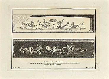 Ancient Roman Fresco from the series "Antiquities of Herculaneum", is an original etching on paper realized by Giovanni Morghen in the 18th Century. Signed on the plate. Good conditions except for some minor stains and a cutting on the part. The etching belongs to the print suite “Antiquities of Herculaneum Exposed” (original title: “Le Antichità di Ercolano Esposte”), an eight-volume volume of engravings of the finds from the excavation of the ruins of Herculaneum in the Kingdom of Naples (now Campania, Italy). It was published between 1757 and 1792 by the Regia Stamperia, and copies were delivered to selected recipients across Europe. Despite the title, the Antiquity of Herculaneum shows objects from all the excavations undertaken by the Bourbons in the Gulf of Naples. These include Pompeii, Stabia and two sites of Herculaneum: Resina and Portici. The Bourbon King Carlo appointed fifteen scholars creating a new “Herculaneum Academy” to study the artifacts and publish the results of the archaeological excavations of the sites.The engravings are of high quality and the accompanying text shows a large scholarship. They were realized by 25 prominent artists involved by the King to prepare drawings and engravings on the finds, among which we can find Giovanni Elia Morghen, Carlo Nolli, Luigi Vanvitelli and Giovanni Battista Casanova.The “Antiquities” was designed more to amaze readers with the quality of the objects in the collection of the King of Naples than to be used in research., following and increasing the interest of 18th century society for the classical culture and Art in particular.Through the exaltation of the classical concept of proportions and harmony, the book was of inspiration to the neoclassical movement in Europe, giving artists and decorators access to a huge shop of Hellenistic motifs. Ref.: National Gallery (Washington), Mark J. Millard Architectural, IV (2000), no. 1; L. Garcia y Garcia, Nova bibliotheca pompeiana (2 v., 1998); Royal Institute of British Architects, British Architectural Library ... Early printed books, 1 (1994), no. 112. U. Pannuti, 'Incisori e disegnatori della Stamperia Reale di Napoli nel secolo XVIII: la pubblicazione delle Antichità di Ercolano', in Xenia antiqua, 9 (2000), p. 151-178; V. Trombetta, 'L'edizione de Le Antichità di Ercolano esposte' in Rendiconti dell'Accademia di Archeologia, lettere e belle arti di Napoli , 59 (1984), p.151-172.