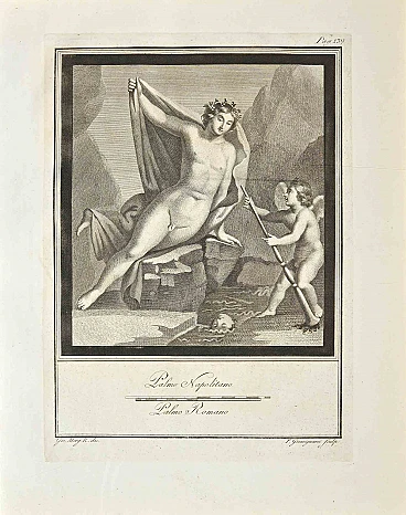Ancient Roman Fresco from the series "Antiquities of Herculaneum", is an original etching on paper realized by Giovanni Morghen in the 18th Century. Signed on the plate. Good conditions except for some minor stains and a cutting on the part. The etching belongs to the print suite “Antiquities of Herculaneum Exposed” (original title: “Le Antichità di Ercolano Esposte”), an eight-volume volume of engravings of the finds from the excavation of the ruins of Herculaneum in the Kingdom of Naples (now Campania, Italy). It was published between 1757 and 1792 by the Regia Stamperia, and copies were delivered to selected recipients across Europe. Despite the title, the Antiquity of Herculaneum shows objects from all the excavations undertaken by the Bourbons in the Gulf of Naples. These include Pompeii, Stabia and two sites of Herculaneum: Resina and Portici. The Bourbon King Carlo appointed fifteen scholars creating a new “Herculaneum Academy” to study the artifacts and publish the results of the archaeological excavations of the sites.The engravings are of high quality and the accompanying text shows a large scholarship. They were realized by 25 prominent artists involved by the King to prepare drawings and engravings on the finds, among which we can find Giovanni Elia Morghen, Carlo Nolli, Luigi Vanvitelli and Giovanni Battista Casanova.The “Antiquities” was designed more to amaze readers with the quality of the objects in the collection of the King of Naples than to be used in research., following and increasing the interest of 18th century society for the classical culture and Art in particular.Through the exaltation of the classical concept of proportions and harmony, the book was of inspiration to the neoclassical movement in Europe, giving artists and decorators access to a huge shop of Hellenistic motifs. Ref.: National Gallery (Washington), Mark J. Millard Architectural, IV (2000), no. 1; L. Garcia y Garcia, Nova bibliotheca pompeiana (2 v., 1998); Royal Institute of British Architects, British Architectural Library ... Early printed books, 1 (1994), no. 112. U. Pannuti, 'Incisori e disegnatori della Stamperia Reale di Napoli nel secolo XVIII: la pubblicazione delle Antichità di Ercolano', in Xenia antiqua, 9 (2000), p. 151-178; V. Trombetta, 'L'edizione de Le Antichità di Ercolano esposte' in Rendiconti dell'Accademia di Archeologia, lettere e belle arti di Napoli , 59 (1984), p.151-172.