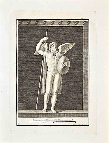 Ancient Roman Statues from the series "Antiquities of Herculaneum", is an original etching on paper realized by Francesco Cepparoli in the 18th Century. Signed on the plate. Good conditions except for some minor stains and a cutting on the part. The etching belongs to the print suite “Antiquities of Herculaneum Exposed” (original title: “Le Antichità di Ercolano Esposte”), an eight-volume volume of engravings of the finds from the excavation of the ruins of Herculaneum in the Kingdom of Naples (now Campania, Italy). It was published between 1757 and 1792 by the Regia Stamperia, and copies were delivered to selected recipients across Europe. Despite the title, the Antiquity of Herculaneum shows objects from all the excavations undertaken by the Bourbons in the Gulf of Naples. These include Pompeii, Stabia and two sites of Herculaneum: Resina and Portici. The Bourbon King Carlo appointed fifteen scholars creating a new “Herculaneum Academy” to study the artifacts and publish the results of the archaeological excavations of the sites.The engravings are of high quality and the accompanying text shows a large scholarship. They were realized by 25 prominent artists involved by the King to prepare drawings and engravings on the finds, among which we can find Giovanni Elia Morghen, Carlo Nolli, Luigi Vanvitelli and Giovanni Battista Casanova.The “Antiquities” was designed more to amaze readers with the quality of the objects in the collection of the King of Naples than to be used in research., following and increasing the interest of 18th century society for the classical culture and Art in particular.Through the exaltation of the classical concept of proportions and harmony, the book was of inspiration to the neoclassical movement in Europe, giving artists and decorators access to a huge shop of Hellenistic motifs. Ref.: National Gallery (Washington), Mark J. Millard Architectural, IV (2000), no. 1; L. Garcia y Garcia, Nova bibliotheca pompeiana (2 v., 1998); Royal Institute of British Architects, British Architectural Library ... Early printed books, 1 (1994), no. 112. U. Pannuti, 'Incisori e disegnatori della Stamperia Reale di Napoli nel secolo XVIII: la pubblicazione delle Antichità di Ercolano', in Xenia antiqua, 9 (2000), p. 151-178; V. Trombetta, 'L'edizione de Le Antichità di Ercolano esposte' in Rendiconti dell'Accademia di Archeologia, lettere e belle arti di Napoli , 59 (1984), p.151-172.