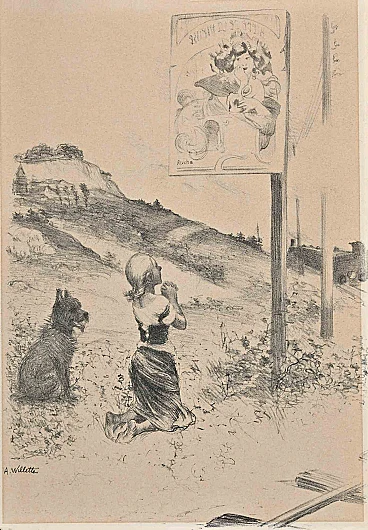 Praying Macha is an Original Lithograph realized by Willette (Adolphe Léon).Good condition on a yellowed paper.Hand signed withpencil on the lower left corner.Adolphe Léon Willette (30 July 1857, Châlons-sur-Marne – 4 February 1926, Paris) was a French painter, illustrator, caricaturist, and lithographer, as well as an architect of the famous Moulin Rouge cabaret. Willette ran as an "anti-semitic" candidate in the 9th arrondissement of Paris for the September 1889 legislative elections. Collect a very beautiful artwork of 20th century!