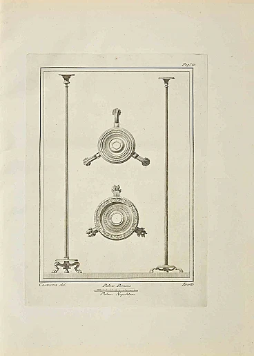Ancient Roman Statue of Herculaneum from the series "Antiquities of Herculaneum", is an original etching on paper realized by Casanova in the 18th Century. Signed on the plate. Good conditions with a small cut on the lower right. The etching belongs to the print suite “Antiquities of Herculaneum Exposed” (original title: “Le Antichità di Ercolano Esposte”), an eight-volume volume of engravings of the finds from the excavation of the ruins of Herculaneum in the Kingdom of Naples (now Campania, Italy). It was published between 1757 and 1792 by the Regia Stamperia, and copies were delivered to selected recipients across Europe. Despite the title, the Antiquity of Herculaneum shows objects from all the excavations undertaken by the Bourbons in the Gulf of Naples. These include Pompeii, Stabia and two sites of Herculaneum: Resina and Portici. The Bourbon King Carlo appointed fifteen scholars creating a new “Herculaneum Academy” to study the artifacts and publish the results of the archaeological excavations of the sites.The engravings are of high quality and the accompanying text shows a large scholarship. They were realized by 25 prominent artists involved by the King to prepare drawings and engravings on the finds, among which we can find Giovanni Elia Morghen, Carlo Nolli, Luigi Vanvitelli and Giovanni Battista Casanova.The “Antiquities” was designed more to amaze readers with the quality of the objects in the collection of the King of Naples than to be used in research., following and increasing the interest of 18th century society for the classical culture and Art in particular.Through the exaltation of the classical concept of proportions and harmony, the book was of inspiration to the neoclassical movement in Europe, giving artists and decorators access to a huge shop of Hellenistic motifs. Ref.: National Gallery (Washington), Mark J. Millard Architectural, IV (2000), no. 1; L. Garcia y Garcia, Nova bibliotheca pompeiana (2 v., 1998); Royal Institute of British Architects, British Architectural Library ... Early printed books, 1 (1994), no. 112. U. Pannuti, 'Incisori e disegnatori della Stamperia Reale di Napoli nel secolo XVIII: la pubblicazione delle Antichità di Ercolano', in Xenia antiqua, 9 (2000), p. 151-178; V. Trombetta, 'L'edizione de Le Antichità di Ercolano esposte' in Rendiconti dell'Accademia di Archeologia, lettere e belle arti di Napoli , 59 (1984), p.151-172.