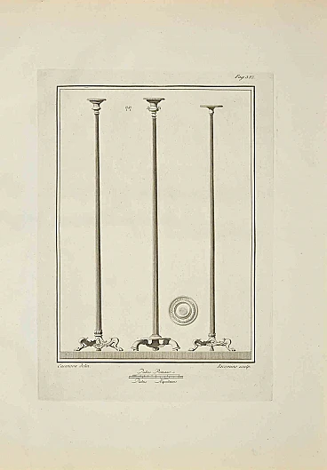 Ancient Roman Statue of Herculaneum from the series "Antiquities of Herculaneum", is an original etching on paper realized by R. Casanova. in the 18th Century. Signed on the plate. Good conditions. The etching belongs to the print suite “Antiquities of Herculaneum Exposed” (original title: “Le Antichità di Ercolano Esposte”), an eight-volume volume of engravings of the finds from the excavation of the ruins of Herculaneum in the Kingdom of Naples (now Campania, Italy). It was published between 1757 and 1792 by the Regia Stamperia, and copies were delivered to selected recipients across Europe. Despite the title, the Antiquity of Herculaneum shows objects from all the excavations undertaken by the Bourbons in the Gulf of Naples. These include Pompeii, Stabia and two sites of Herculaneum: Resina and Portici. The Bourbon King Carlo appointed fifteen scholars creating a new “Herculaneum Academy” to study the artifacts and publish the results of the archaeological excavations of the sites.The engravings are of high quality and the accompanying text shows a large scholarship. They were realized by 25 prominent artists involved by the King to prepare drawings and engravings on the finds, among which we can find Giovanni Elia Morghen, Carlo Nolli, Luigi Vanvitelli and Giovanni Battista Casanova.The “Antiquities” was designed more to amaze readers with the quality of the objects in the collection of the King of Naples than to be used in research., following and increasing the interest of 18th century society for the classical culture and Art in particular.Through the exaltation of the classical concept of proportions and harmony, the book was of inspiration to the neoclassical movement in Europe, giving artists and decorators access to a huge shop of Hellenistic motifs. Ref.: National Gallery (Washington), Mark J. Millard Architectural, IV (2000), no. 1; L. Garcia y Garcia, Nova bibliotheca pompeiana (2 v., 1998); Royal Institute of British Architects, British Architectural Library ... Early printed books, 1 (1994), no. 112. U. Pannuti, 'Incisori e disegnatori della Stamperia Reale di Napoli nel secolo XVIII: la pubblicazione delle Antichità di Ercolano', in Xenia antiqua, 9 (2000), p. 151-178; V. Trombetta, 'L'edizione de Le Antichità di Ercolano esposte' in Rendiconti dell'Accademia di Archeologia, lettere e belle arti di Napoli , 59 (1984), p.151-172.