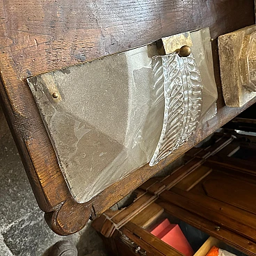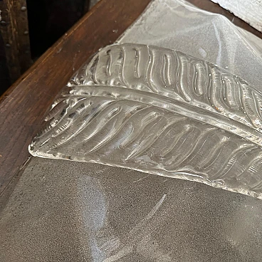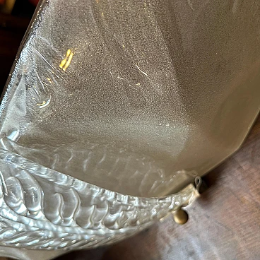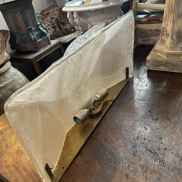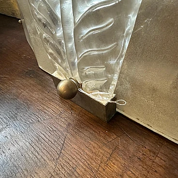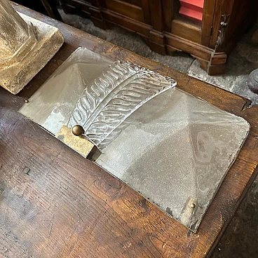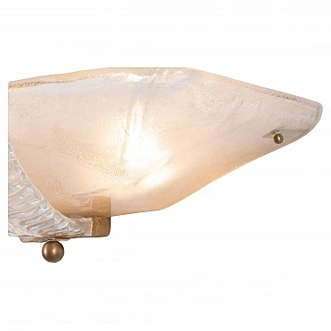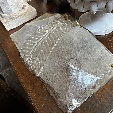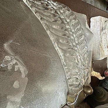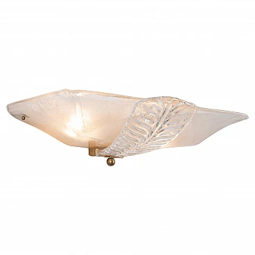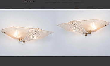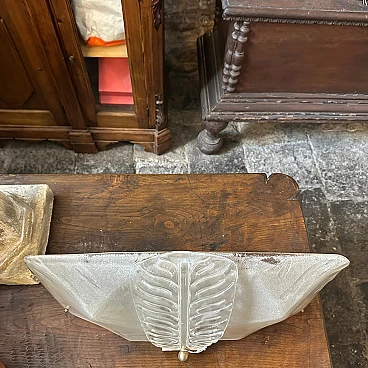 Pair of Art Deco wall lights by Ercole Barovier, 1930s. Large two-light lamps with brass structure and Murano glass diffusers. The design embodies the elegant, geometric aesthetic of the Art Deco period, characterized by clean lines and symmetrical shapes. The glass is slightly opalescent with a subtle shimmer that adds to its elegance. Each lamp features a central leaf-shaped decoration that showcases intricate, handcrafted details. The glass is mounted on a brass structure with a small brass knob visible at the bottom, completing the overall design. The combination of translucent glass and brass frame creates a striking and elegant look, making these lamps a beautiful addition to any interior, especially those in a vintage or Art Deco style. The two wall lights are in perfect condition and working.