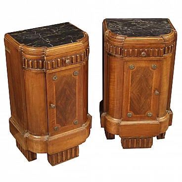 Pair of Italian Art Deco period bedside tables. Carved and inlaid furniture in walnut, maple, bois de rose and beech of beautiful line and pleasant furnishings. Bedside tables of great character equipped with a door and a drawer of good capacity and service. Top in original recessed marble (see photo). Nightstands adorned with decorations in bronze and gilded and chiseled brass (see photo) of excellent quality. Furniture for antique dealers and interior decorators ideal to insert in a bedroom or living room. They present some small signs of the time, overall in good state of preservation and beautiful patina.