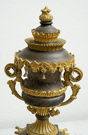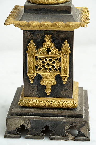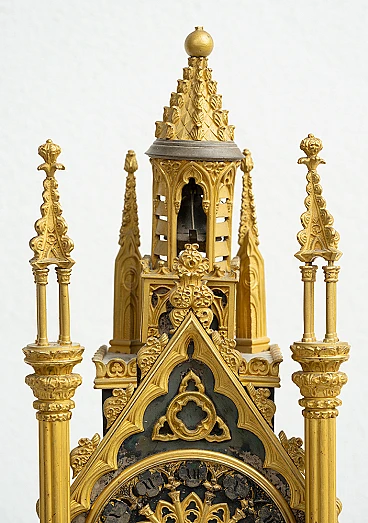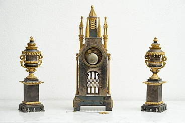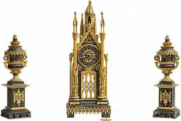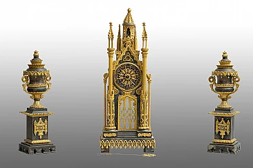 Neo-Gothic Charles X clock triptych in gilded and patinated bronze made in France in the early 19th century. The clock has the shape of a classic French Gothic cathedral with two side columns ending in spires and a central rose window. The mechanism, in need to be overhauled, has a double chime one at the back and the other in the central spire with a bell inside. The two side chests have a central cup chiseled with racemes and flowers resting on a square base. In need of restoration. The clock is 50 cm high, 20 cm wide and 10 cm deep. The cassolettes are 35 cm high, 10 cm wide and 10 cm deep. Complete with certificate of authenticity. We are at your disposal for further clarification or photographic details. Safe and traceable shipping throughout Italy, Europe and Rest of the World. Shipping will be arranged privately.