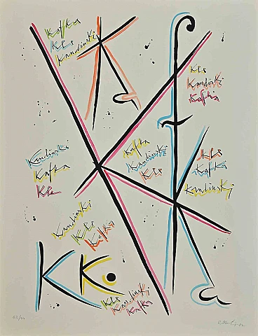 Letter K from the Alphabet series is an original lithograph realized by Rafael Alberti in 1972.Hand-signed on the lower right.Numbered, edition 52/99.The state of preservation is good.The artwork represents the alphabet letter, with a poetical abstract composition which is Rafael Alberti's style of expression, joyfully creating a dreamlike vision of the world of the literature through vivid colors and shapes, characterized by soft strokes in harmony like musical tones. Rafael Alberti (El Puerto de Santa Maria 1902 – El Puerto de Santa Maria 1999), a Spanish poet born in Puerto de Santa Maria in 1902, Rafael Alberti is one of the leading exponents of the Generation of ’27 and one of Spain’s greatest XXth Century lyrical poets. After starting out as a painter, in 1925 he won the Premio Nacional de Literatura, for his collected poems, Marinero en tierra (Sailor on Land). Alberti started painting in 1917 and began writing poetry three years later. He was a close friend of artists such as Salvador Dalì and Pablo Picasso, and poet Federico Garcia Lorca, and in the late 1920s published his dark, lyrical masterpiece Sobre los angeles (Concerning the Angels). Politics became increasingly important in Alberti’s life, forcing him into exile after Francisco Franco’s victory in the Spanish Civil War. In 1963 he moved to Rome together with his life-long companion, Maria Teresa Léon, and it was in Italy that – influenced by the avant-garde movements of the XXth Century – he became active as a painter and graphic artist while continuing to write poetry. After settling in a house with a studio in Anticoli Corrado, Alberti devoted himself to both forms of art, moving between poems devoted to nature and culture, and existential reflections suspended between the world of dreams and reality.