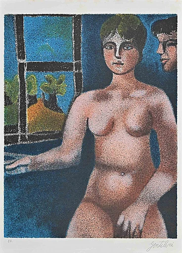 Nude is an original lithograph, realized by Franco Gentilini (Italian Painter, 1909-1981), in the 1980.The state of preservation of the artwork is excellent.Artist's proof.Hand-signed.Franco Gentilini ( Italian Painter, 1909-1981): Gentilini's artistic world was formed in the context of Italian culture between the Second World War and the postwar period. The artist perfects his technical note characterized by a happy combination of painting and drawing on a preparatory material background mixed with sand. The themes of his works are cathedrals, baptisteries, jugglers and buskers, landscapes with irregular perspectives, women characterized by ankle boots with spool heels, bicycles, trucks, cats and lions. Gentilini is the artist of joie de vivre, despite the fact that in recent years he portrayed a world shattered by the Second World War.Since the mid-fifties his research has been directed towards an essential geometric stylization which, by making use of overturned perspectives and skewed planes, finds a completely new and personal compositional balance. To celebrate the centenary of the artist's birth, several retrospectives were held in public spaces (Pericle Fazzini Museum in Assisi and Museo della Permanente in Milan) organized largely by his wife Luciana Giuntoli who also took care of the collection of his personal archive.