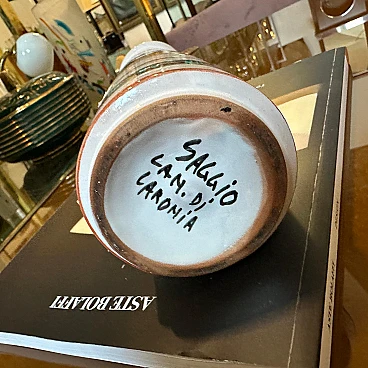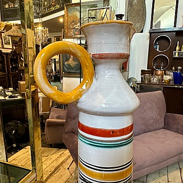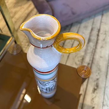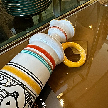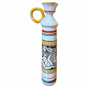 This jug is a beautiful example of modernist design fused with traditional Sicilian artistic elements, featuring vibrant colours, intricate patterns and a focus on quality craftsmanship. Its unique aesthetic makes it a signature piece of the 1970s. It is in original condition, never restored, and has normal signs of use and age visible in the photos. The jug has a white base and horizontal bands of various colors, including yellow, red, green and black, giving it a vibrant and dynamic appearance. The handle is painted bright yellow. The body is adorned with intricate hand-painted designs. In particular, there is the depiction of a naked female figure among abstract and natural elements, which suggests a celebration of life and nature, common in Sicilian art. The lower part features further decorative bands with geometric motifs, which underline the artisanal nature of the piece. It is signed on the bottom "Saggio, cam. di Caronia".
