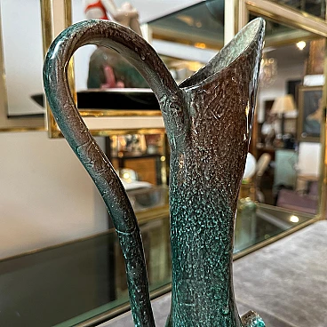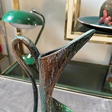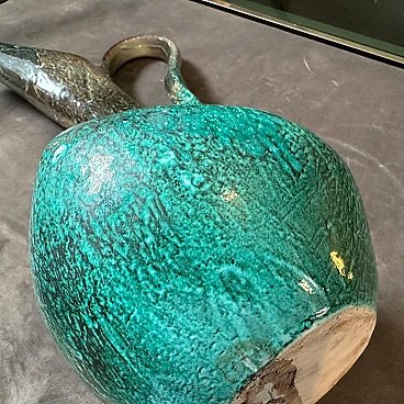 Green ceramic jug vase handmade in Italy in the 1950s. Good overall condition with signs of use and age visible in the photos. This piece stands out for its sculptural form and distinctive glaze, typical of mid-century Italian ceramics. The design and color scheme reflect the era's emphasis on elegant, organic shapes and bold, vibrant colors. It's green with a smoky, speckled finish, transitioning from darker shades at the top to lighter shades at the bottom. The jug has an elongated, asymmetrical neck that widens at the top. It has a unique and artistic handle that gracefully meanders from the base to the top. This jug, which can also be used as a vase, is a unique, high-quality handmade piece.