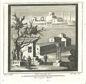 Landscape from the series "Antiquities of Herculaneum", is an original etching on paper realized by Niccolò Ricci in the 18th Century. Signed on the plate. Good conditions. The etching belongs to the print suite “Antiquities of Herculaneum Exposed” (original title: “Le Antichità di Ercolano Esposte”), an eight-volume volume of engravings of the finds from the excavation of the ruins of Herculaneum in the Kingdom of Naples (now Campania, Italy). It was published between 1757 and 1792 by the Regia Stamperia, and copies were delivered to selected recipients across Europe. Despite the title, the Antiquity of Herculaneum shows objects from all the excavations undertaken by the Bourbons in the Gulf of Naples. These include Pompeii, Stabia and two sites of Herculaneum: Resina and Portici. The Bourbon King Carlo appointed fifteen scholars creating a new “Herculaneum Academy” to study the artifacts and publish the results of the archaeological excavations of the sites.The engravings are of high quality and the accompanying text shows a large scholarship. They were realized by 25 prominent artists involved by the King to prepare drawings and engravings on the finds, among which we can find Giovanni Elia Morghen, Carlo Nolli, Luigi Vanvitelli and Giovanni Battista Casanova.The “Antiquities” was designed more to amaze readers with the quality of the objects in the collection of the King of Naples than to be used in research., following and increasing the interest of 18th century society for the classical culture and Art in particular.Through the exaltation of the classical concept of proportions and harmony, the book was of inspiration to the neoclassical movement in Europe, giving artists and decorators access to a huge shop of Hellenistic motifs. Ref.: National Gallery (Washington), Mark J. Millard Architectural, IV (2000), no. 1; L. Garcia y Garcia, Nova bibliotheca pompeiana (2 v., 1998); Royal Institute of British Architects, British Architectural Library ... Early printed books, 1 (1994), no. 112. U. Pannuti, 'Incisori e disegnatori della Stamperia Reale di Napoli nel secolo XVIII: la pubblicazione delle Antichità di Ercolano', in Xenia antiqua, 9 (2000), p. 151-178; V. Trombetta, 'L'edizione de Le Antichità di Ercolano esposte' in Rendiconti dell'Accademia di Archeologia, lettere e belle arti di Napoli , 59 (1984), p.151-172.