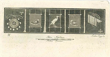 Ancient Roman Composition from the series "Antiquities of Herculaneum", is an original etching on paper realized by Isidoro Frezza in the 18th Century. Signed on the plate. Good conditions with some foxing. The etching belongs to the print suite “Antiquities of Herculaneum Exposed” (original title: “Le Antichità di Ercolano Esposte”), an eight-volume volume of engravings of the finds from the excavation of the ruins of Herculaneum in the Kingdom of Naples (now Campania, Italy). It was published between 1757 and 1792 by the Regia Stamperia, and copies were delivered to selected recipients across Europe. Despite the title, the Antiquity of Herculaneum shows objects from all the excavations undertaken by the Bourbons in the Gulf of Naples. These include Pompeii, Stabia and two sites of Herculaneum: Resina and Portici. The Bourbon King Carlo appointed fifteen scholars creating a new “Herculaneum Academy” to study the artifacts and publish the results of the archaeological excavations of the sites.The engravings are of high quality and the accompanying text shows a large scholarship. They were realized by 25 prominent artists involved by the King to prepare drawings and engravings on the finds, among which we can find Giovanni Elia Morghen, Carlo Nolli, Luigi Vanvitelli and Giovanni Battista Casanova.The “Antiquities” was designed more to amaze readers with the quality of the objects in the collection of the King of Naples than to be used in research., following and increasing the interest of 18th century society for the classical culture and Art in particular.Through the exaltation of the classical concept of proportions and harmony, the book was of inspiration to the neoclassical movement in Europe, giving artists and decorators access to a huge shop of Hellenistic motifs. Ref.: National Gallery (Washington), Mark J. Millard Architectural, IV (2000), no. 1; L. Garcia y Garcia, Nova bibliotheca pompeiana (2 v., 1998); Royal Institute of British Architects, British Architectural Library ... Early printed books, 1 (1994), no. 112. U. Pannuti, 'Incisori e disegnatori della Stamperia Reale di Napoli nel secolo XVIII: la pubblicazione delle Antichità di Ercolano', in Xenia antiqua, 9 (2000), p. 151-178; V. Trombetta, 'L'edizione de Le Antichità di Ercolano esposte' in Rendiconti dell'Accademia di Archeologia, lettere e belle arti di Napoli , 59 (1984), p.151-172.