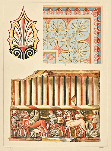 Decorative Motifs - Etruscan Styles is a print on ivory-colored paper realized by Andrea Alessio in the early 20th Century. Signed on the plate on the lower.Vintage Chromolithograph.Very good conditions.The artwork represents Decorative motifs through well-defined details with vivid and harmonious colors beautifully.