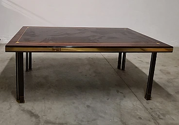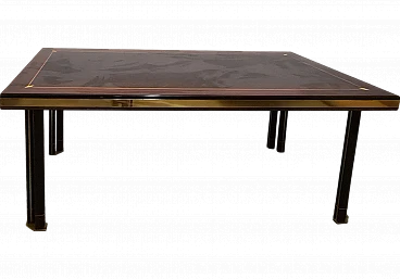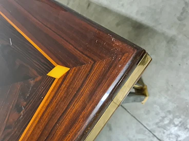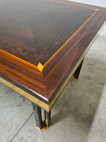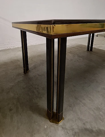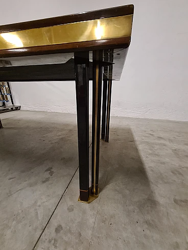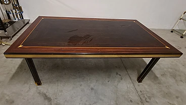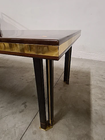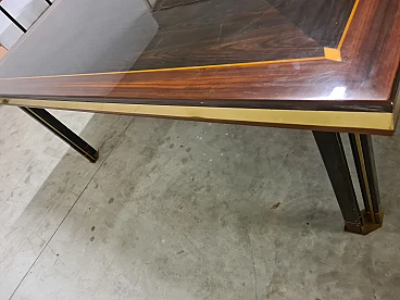 Large dining table by Paolo Baracchia for Roman Deco. Wooden table with clear inlays and brass finishes, supported by four twin legs with brass feet. Refined and elegant, the surface is polyester lacquered.