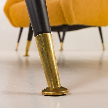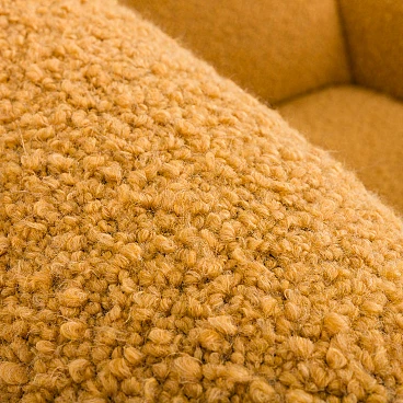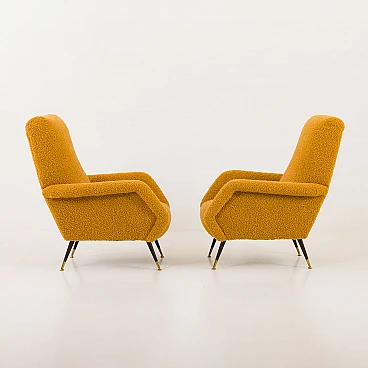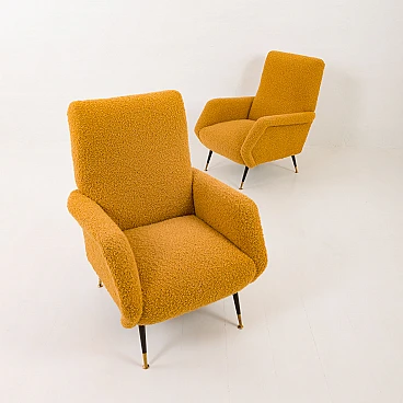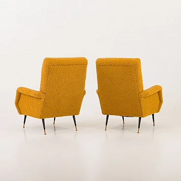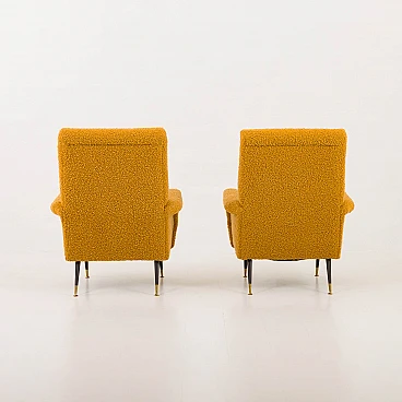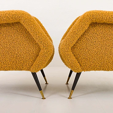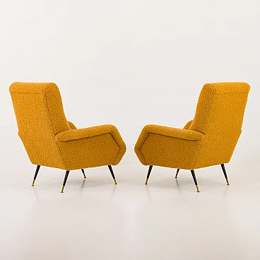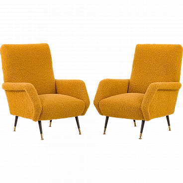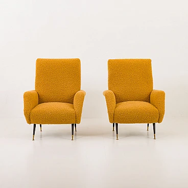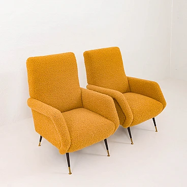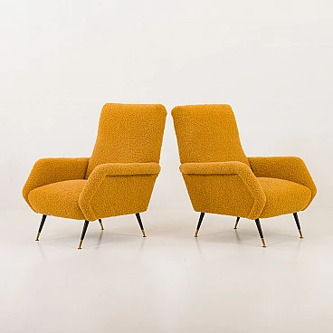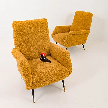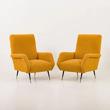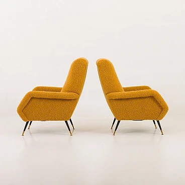 Pair of armchairs attributed to Gigi Radice for Minotti, 1950s. They capture the essence of the iconic armchair mod. 099 by Radice. These armchairs, with their unique shape and exquisite comfort, bring a touch of mid-century aesthetics to modern interiors. The new covering is characterized by a honey-colored wool bouclé fabric, which gives warmth and comfort. This type of wool is prized for its softness, durability and hypoallergenic properties, making it an ideal choice for high-quality furniture. Gigi Radice's designs are known for their distinctive shapes and timeless appeal. These armchairs feature Radice's signature clean lines and minimalist silhouette. The gently curved backrests and elegantly angled armrests offer not only an attractive look but also superior comfort. Furthermore, the tapered metal legs with charming copper-covered feet represent the distinctive style of 1950s Italian design. All these features make the armchairs a perfect combination of form and function for a cozy reading nook or as an elegant addition to the living room. The pair is in excellent condition following restoration, consistently capturing the spirit of the mid-century modern era. The new covering was necessary to fix them and make them fully functional; we believe that the choice of this bold honey color perfectly matches the unique shape of the armchairs and perfectly captures the spirit of that era. Armrest height: 56 cm. Seat height: 40 cm. Height from the ground: 20 cm.
