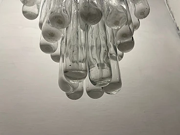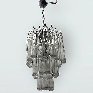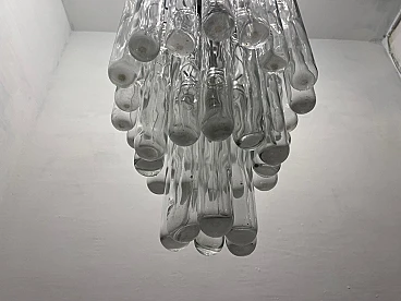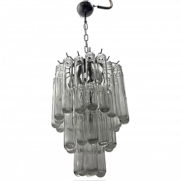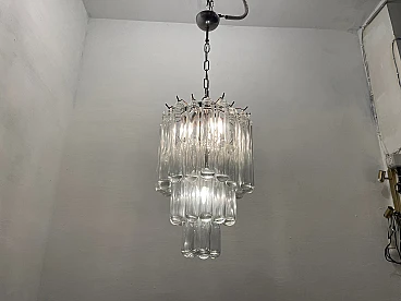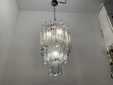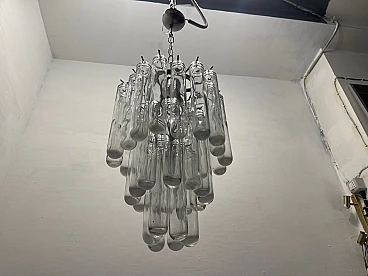 Attribution mark: This piece was designed in the style of the selected designer and/or manufacturer. This chandelier is a vintage Murano glass tube chandelier, attributed to Venini in the 1970s. Height (including chain and rosette): 91 cm, height (without chain): 56 cm, width: 32 cm. Number of lights: 4, bulb type: E14. New wiring installed, compatible with E14 bulbs. The chandelier features 38 Murano glass tubes suspended in tiers, typical of Murano glass craftsmanship of the time. It has been rewired to be compatible with modern E14 bulbs. Light weight, under 40 kg. Good condition, this vintage/antique item may show signs of wear such as scratches and other signs of time.
