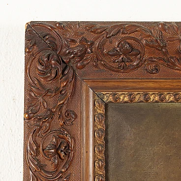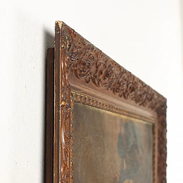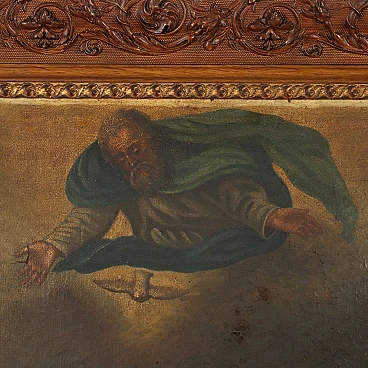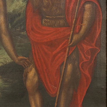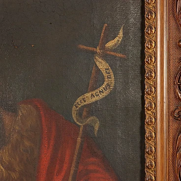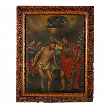 Oil painting on canvas. Christ and John the Baptist are standing side by side, in the waters of the Jordan River: the Saint pours the baptismal water on the head of Jesus, while from above the Father and the Holy Spirit descend from the heavens to celebrate the dignity of the Son. In the background, two pious women assist, the same ones who will follow Jesus for all the years of his preaching, until his Passion. Applied on a wooden frame from the early 1900s, the painting is presented in a frame from the same period.