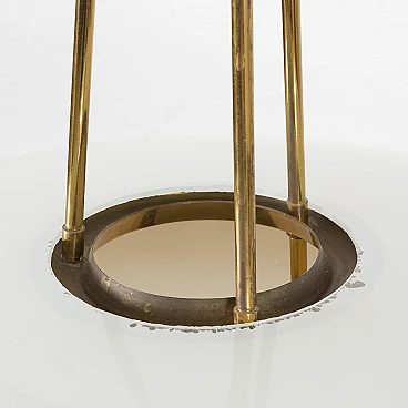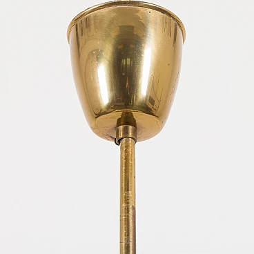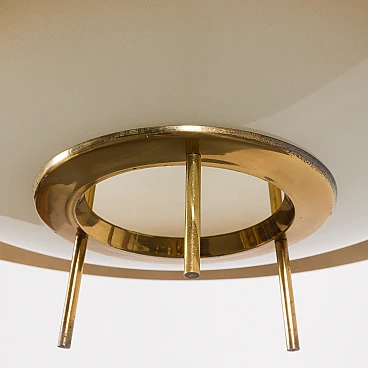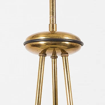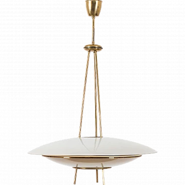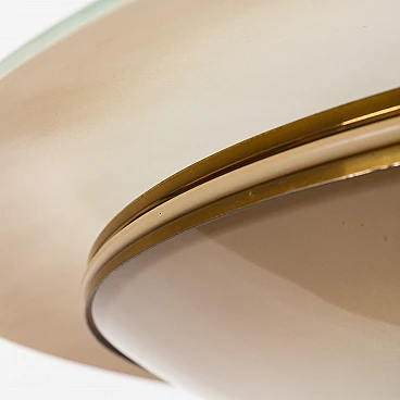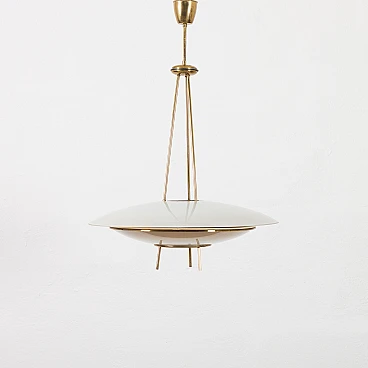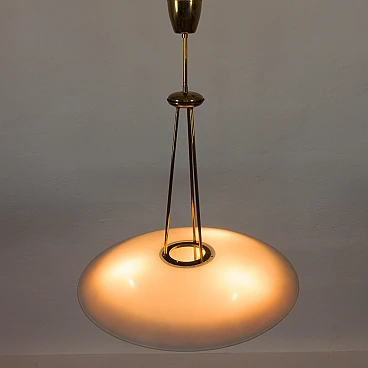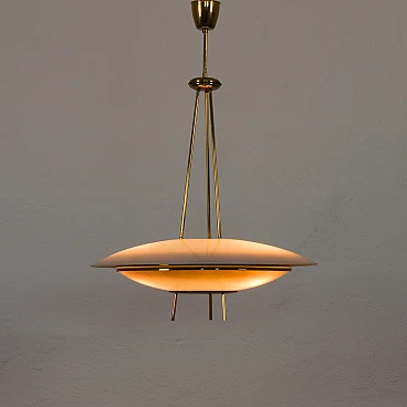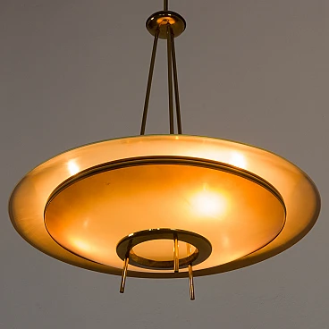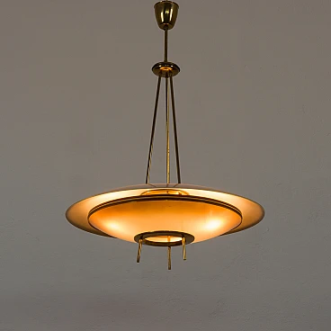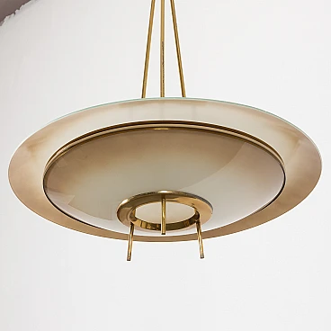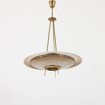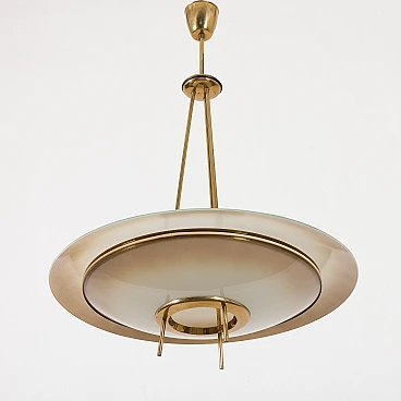 Chandelier by Pietro Chiesa for Fontana Arte, 1950s. It embodies the pinnacle of mid-century Italian modern lighting design. Chiesa is primarily known for his pioneering work with glass and lighting, boasting clean lines, geometric shapes and a minimalist aesthetic. In this particular piece, Chiesa created a lampshade using two plates of glass of different sizes, surrounding horizontally positioned light bulbs to achieve a unique geometric shape. The smoked glass diffusers are made in slightly different shades: the lower, darker one provides a warmer and less sharp light, allowing the upper part to shine. This design allows the chandelier to beautifully diffuse the light, casting a soft, ambient light that elegantly illuminates the space. Both glass shades are positioned on an equally interestingly designed brass structure that divides into three rods, creating the impression of scattered rays. In addition to the aesthetic qualities, the structure has been designed to be highly practical. The brass rings act as supports for each glass plate and match the brass-finished edges of the lower shade, creating a harmonious look. The addition of rods protruding from the bottom gives the entire piece an extremely distinctive look. Despite its vintage origins, the chandelier remains extremely versatile. Its exquisite craftsmanship and innovative, timeless design are evident even more than sixty years later. We have made sure that the lamp works properly and is not damaged. The glass diffusers are perfectly preserved and the brass has developed a beautiful patina over time, enhancing its vintage charm. The lamp requires three E14 bulbs.