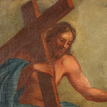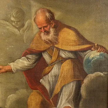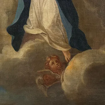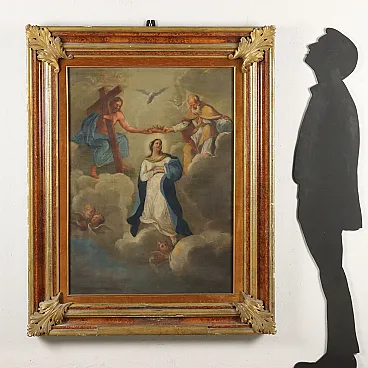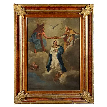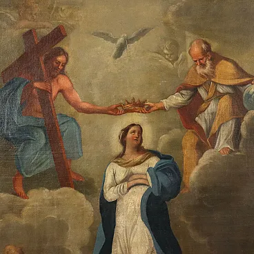 Oil painting on canvas. The large scene depicts Mary, already Assumption into heaven and supported on the clouds by little angels, receiving the Crown from the Holy Trinity. This coronation expresses the apotheosis of Mary, who by becoming "Queen of Heaven" becomes the intermediary between the earth, Humanity, and Heaven, the Divinity: what is not given to man to see becomes possible through Mary who in this glorification is more than ever the tenacious thread that binds us to the Almighty, the true "gate of heaven", as it is defined by the Fathers of the Church. Restored and relined, the painting is presented in an early 20th century frame.