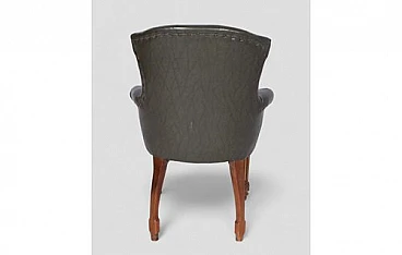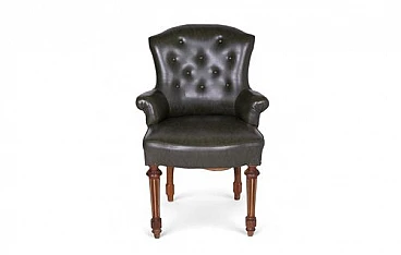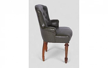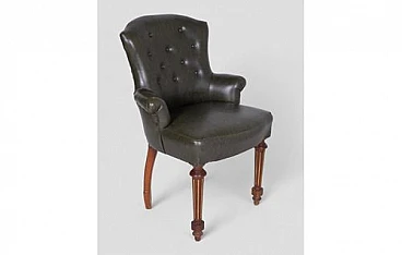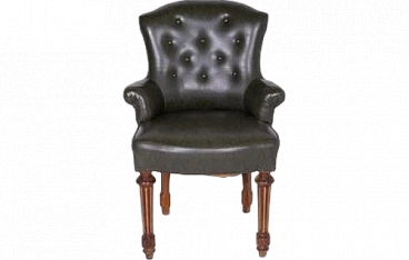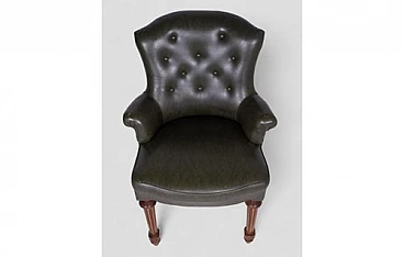 This vintage dark green faux leather armchair is a masterpiece of elegance and comfort, perfect for adding a touch of class to any setting. The soft and durable faux leather wraps around the frame, while the buttons on the backrest give it a classic and refined look. The finely crafted front legs feature light wood details that provide a charming contrast and highlight the piece's craftsmanship quality. These inlaid details add a touch of sophistication and stability to the armchair. Signs of wear over time add authenticity and character to the armchair. Light abrasions on the faux leather and some scratches on the legs testify to its history and enhance its vintage charm.