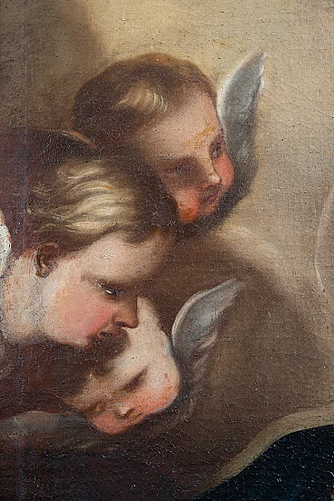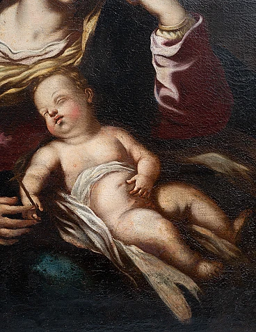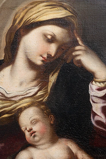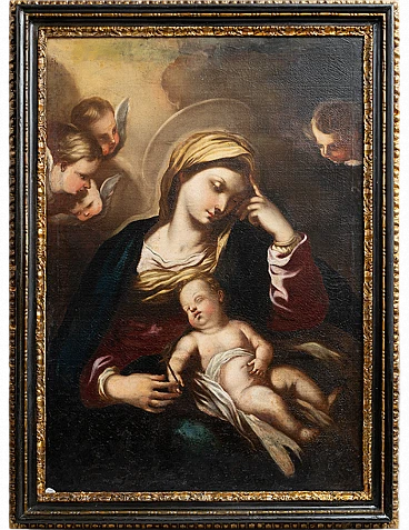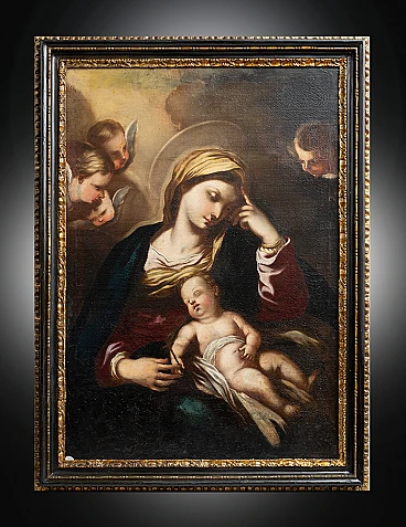 Neapolitan oil painting on canvas depicting a Madonna and Child, 18th century. In this work, the painter expresses several elements of his poetics moving from the diffuse airiness of Rococo to a darkness more typical of Neapolitan Baroque. The strong plastic prominence of the figures emphasized by chiaroscuro suggests a dating in the early 18th century. Complete with certificate of authenticity. We are at your disposal for further clarification or photographic details. Shipment throughout Italy, Europe and the Rest of the World in maximum security and traceable. Shipping will be arranged privately.