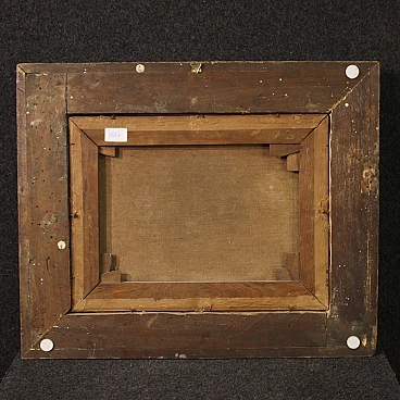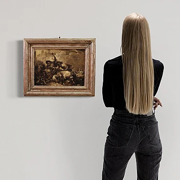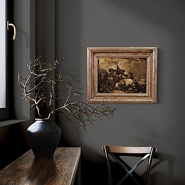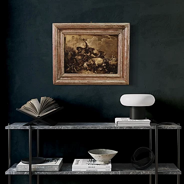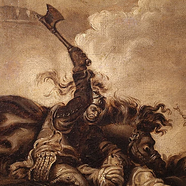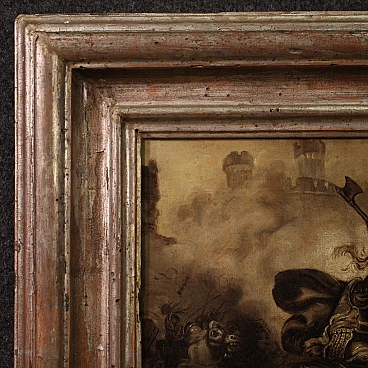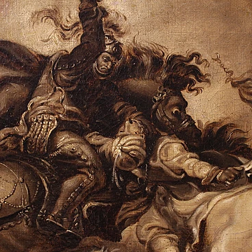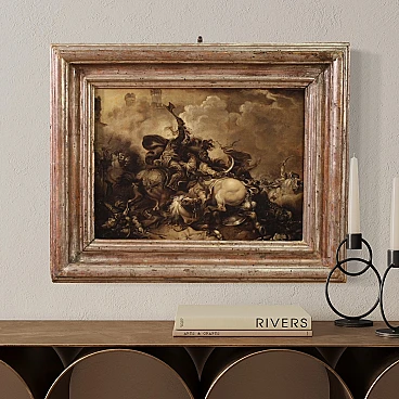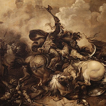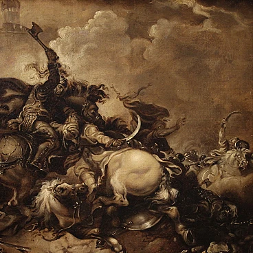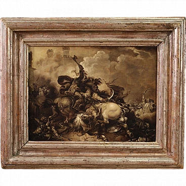 Ancient French battle from the second half of the 17th century. Oil on canvas work of extraordinary pictorial quality created through a masterful use of grisaille, a monochrome technique that reproduces volumes, lights and shadows through various shades of grey. The painting depicts a bloody clash between Christian and Turkish cavalry at the gates of a city protected by medieval walls. Splendid runaway horses, unhorsed knights, ax and scimitar blows create a dramatic composition characterized by great dynamism. 19th century frame in carved and silvered wood, with some signs of aging (see photo). Work already restored with relining and replacement of the frame, overall in excellent state of conservation. Painting light H 28.5 x W 38 cm.