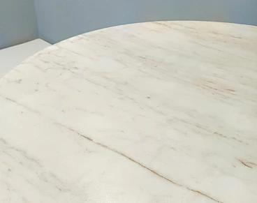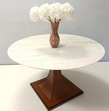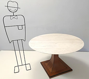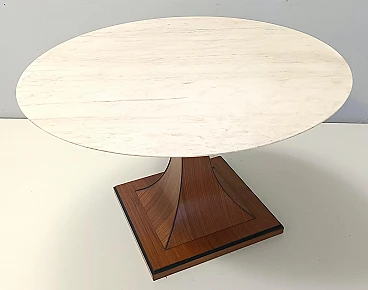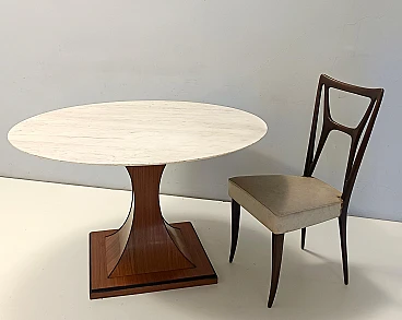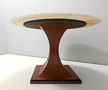 It features a Portuguese pink marble top and an ebonized Canaletto walnut pedestal. It is perfect for 6 people. It may show slight traces of use since it's vintage, but it can be considered as in very good original condition and ready to become a piece in a home. The pedestal has its original patina. Measures: Diameter 120 cm Height 73 cm.