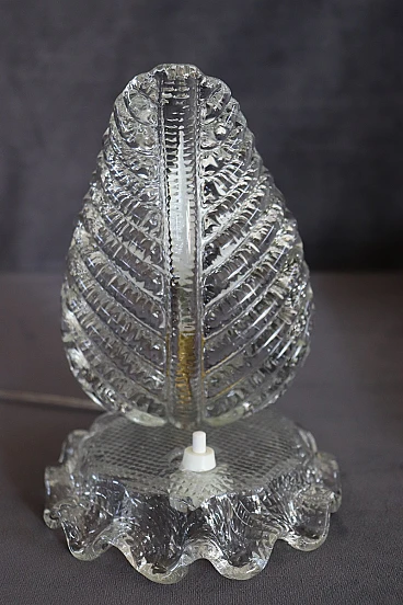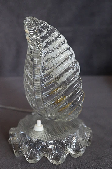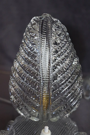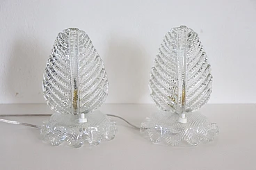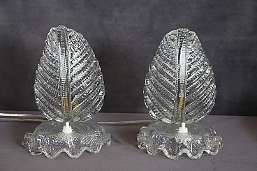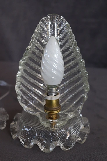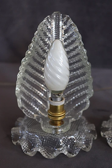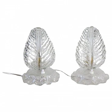 Pair of table lamps from the 1950s with a clear influence of Barovier & Toso, one of the most prestigious Murano glassworks, to which it can be attributed. Distinctive features are the workmanship of thick, transparent Murano glass and the distinctive leaf shape, an iconic mid-century pattern. The lamps have been restored with an overhauled electrical system and new wiring, making them safe and ready for use. Despite the absence of marks or signatures, the quality of the glass and the design are strong indicators of their probable origin. The perfect condition adds to their value, making them a valuable piece for collectors and vintage design enthusiasts. It is important, as suggested, to carefully examine all attached photos to evaluate the condition of the lamps and ensure they meet your expectations before purchasing. For those interested, the price is negotiable, so it is possible to make an offer which will be evaluated by the seller. These are used items, they may show light signs of use as they are not specifically mentioned, so it is always advisable to communicate directly with the seller for any questions or further details before confirming the purchase.