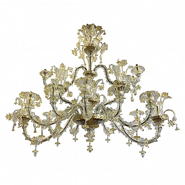 Murano glass boat chandelier, Rezzonico style, from the first half of the 20th century (1930s-40s), blown and handcrafted using an ancient technique. On each golden metal arm are inserted, piece by piece, the glass called "bossole" made in "rigadin" (longitudinal or spiral striations) that make up the chandelier. It stands out for its precious Gold Crystal decoration and the precious details of flowers and leaves hand-finished by Murano glass masters. The chandelier in question, completely restored and rewired, presents a system composed of 16 lights organized on two orders (12 lower, 4 upper divided on two castles) suitable for containing bulbs with E14 socket.
