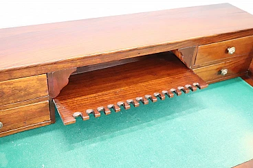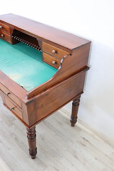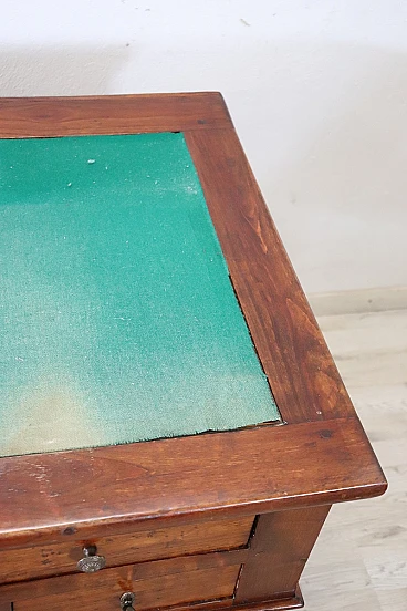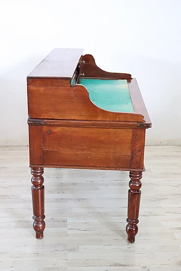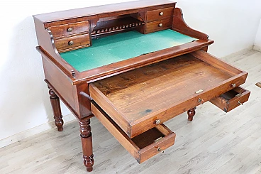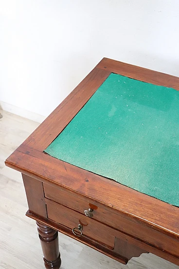 This mid-19th century antique Italian desk in the Luigi Filippo style is a unique piece that will add a touch of elegance and history to your home. Made of fine solid cherry wood, its generous dimensions make it ideal for practical and comfortable use. Stylistic features typical of the era, such as the elegant and solid turned legs, lend a classic and refined charm to this desk. With several drawers of various sizes available, you will have ample space to organise your documents and personal items. The pull-out top in the centre is an interesting and functional detail that makes this desk even more versatile and practical. Despite some signs of wear on the top, the desk is in good overall condition and ready to be used. We recommend replacing the green cloth with leather or faux leather for an extra touch of elegance. The height of the writing surface of 80 cm makes it comfortable for working or writing. The price is negotiable, so please send us your suggestions for purchase, which we will carefully evaluate. As this is an antique piece of furniture, we advise you to carefully examine all the pictures in detail to assess its condition and any defects. This desk is ideal to be placed against a wall, adding a touch of history and class to your home. Please do not hesitate to contact us for further information or to purchase this wonderful antique desk. We are available to answer all your questions and assist you in the purchase process.