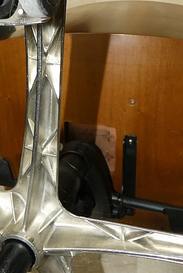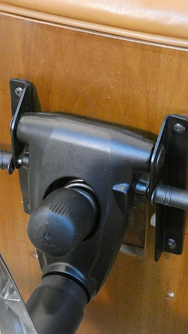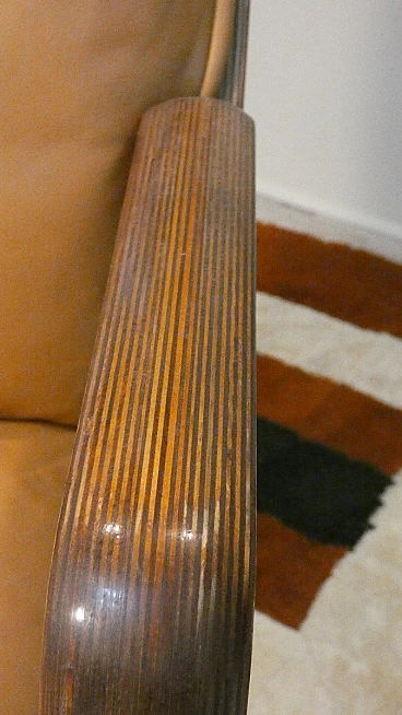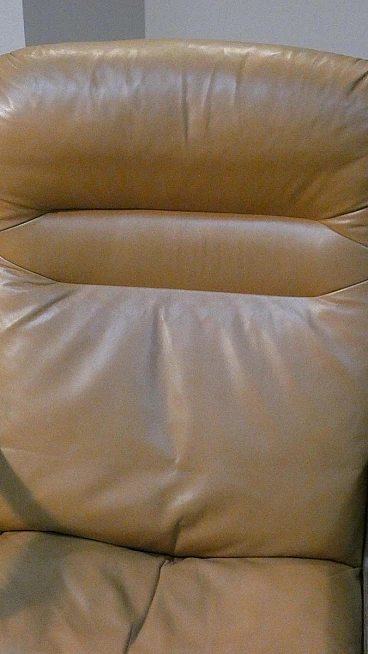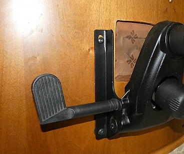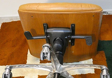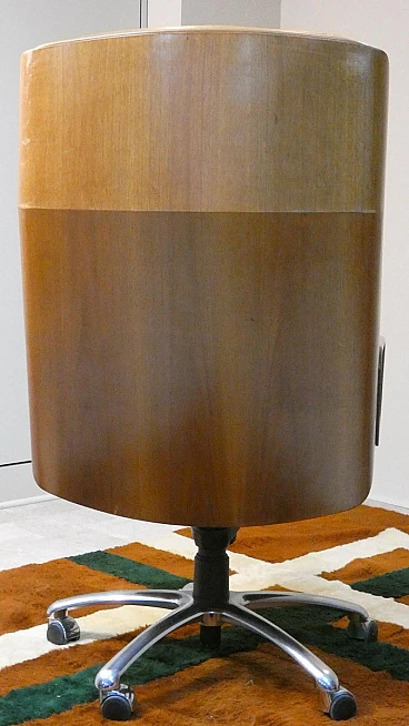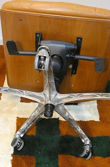 Swivel office chair model Kiruna, produced in 1975. Made of brown leather, rosewood and forged from solid aluminium. Produced in Italy by Vaghi in the 1970s. Vaghi was founded in 1964 as ‘Tappezzeria dei Fratelli Vaghi’ and, thanks to the entrepreneurial spirit of its founders, quickly established itself on the national and international market, becoming a reference company in the office chair sector. This beautiful chair has a backrest in curved plywood and Rosewood laminate. This executive chair, with its understated and timeless elegance, boasts generous proportions and expresses a powerful personality. The design is combined with the finest craftsmanship... soft and enveloping with a sculpted high back and slightly curved contours that promote seating comfort. The chair fits perfectly in modern and retro interiors. Total depth: 53 cm, total width: 64 cm, total height: 125 cms, seat height: 51 cm.