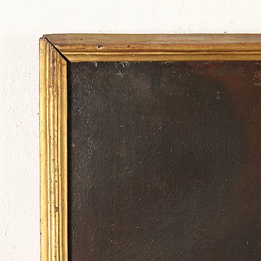 Oil painting on canvas. Large portrait of a priest who, wearing vestments, is kneeling in contemplative prayer in front of the Crucifix, placed on an altar. Behind him on the right there is a glimpse of the town. The light of the Cross radiates on the face of man. Restored and relined, it is presented in a late 19th century frame.