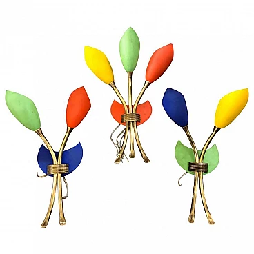 3 colored brass wall sconces, 50s