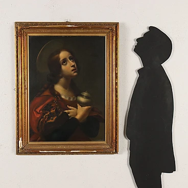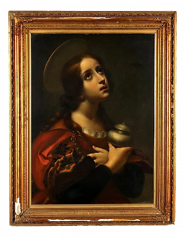 Oil painting on canvas. The painting depicts the so-called \"mirrophora\" Magdalene, that is, the bearer of myrrh for the jar of ointment that she holds in her hands, and which refers to the evangelical episode in which the sinful woman anointed the feet of Jesus with the precious ointment, as recalls the anointing of the body of Jesus taken down from the Cross, at whose feet the saint was.