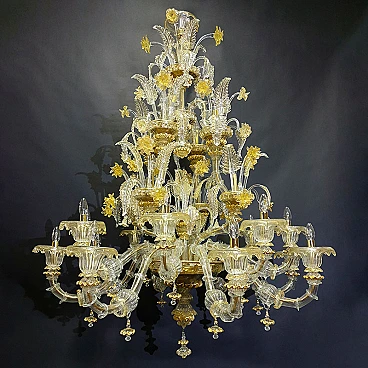 This model, entirely handmade by Murano masters, is characterized by fine Gold Crystal decorations and embellished with refined details of leaves, yellow flowers, cups and curls. It presents a system composed of 24 lights organized in multiple orders.