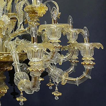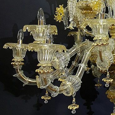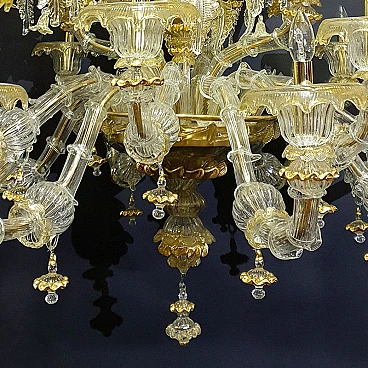 Murano glass chandelier, Rezzonico style, blown and handcrafted with ancient technique. On each golden metal arm are inserted, piece by piece, the glass called "bossole" made in "rigadin" (longitudinal or spiral striations) that make up the chandelier.
