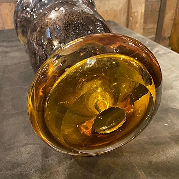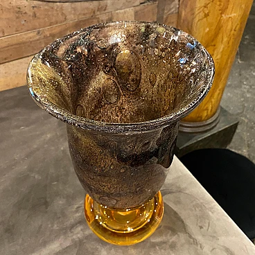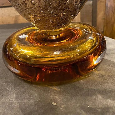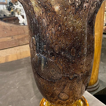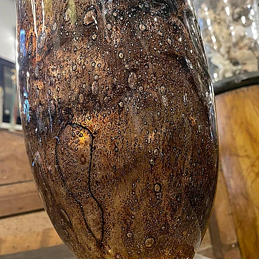 An extremely rare vase designed and manufactured in Murano by Giovanni Cenedese. Its acid signed on a side, brown and amber bubble murano glass it's in very good conditions. The Vase is a striking example of Italian glassmaking mastery and modernist design. Crafted by the renowned glass artist Giovanni Cenedese during the vibrant era of the 1980s, this vase exhibits a harmonious blend of sophistication and innovation. The color palette of rich brown and amber hues adds warmth and depth to the piece, creating a captivating visual contrast. The tones transition seamlessly, creating a dynamic interplay of light and shadow that accentuates the vase's sculptural qualities. Crafted with meticulous attention to detail, the Murano glass exhibits exceptional clarity and luminosity, reflecting the superior craftsmanship for which Giovanni Cenedese is renowned. The surface of the glass is smooth and flawless, showcasing the artist's skillful manipulation of the material.