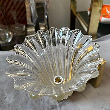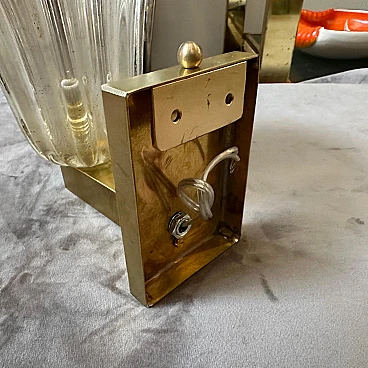 This Barovier wall sconce is a beautiful example of mid-century modern lighting design, showcasing the elegance and quality for which Barovier & Toso are renowned. Its combination of clear Murano glass and brass makes it a timeless addition to any interior space. The sconce has a clear glass shade, crafted from high-quality Murano glass. The glas shade resembling a fluted vase, it features vertical ribbing, adding texture and visual interest. The mounting structure of the sconce is made of brass, which provides a warm, contrasting element to the clear glass. The brass has a polished finish, enhancing its reflective properties and adding a luxurious touch. The sconce is designed to be compact, making it suitable for various wall spaces while still serving as a decorative and functional light fixture. They are not only a source of light but also a decorative piece that adds sophistication to any interior.