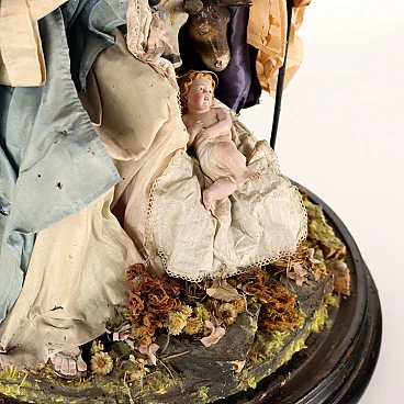 The seated Madonna and standing Saint Joseph turn an adoring gaze to the baby Jesus placed in a sheet on the manger, the faces of the two animals appear between them, while three cherubs hang in flight on a sort of architectural capriccio with a column. Missing protective glass case. The figurines are typically made with a terracotta bust