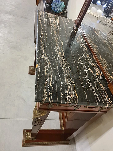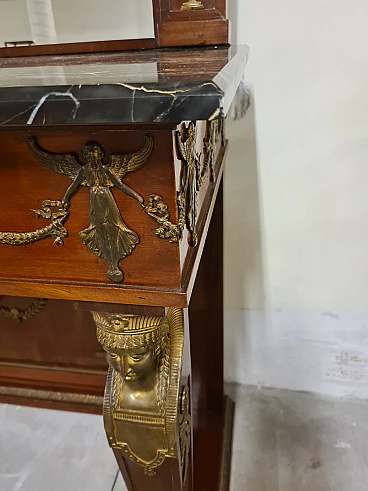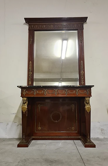 Elegant and severe Empire style console with mirror made of mahogany feather with gilded bronze decorations.