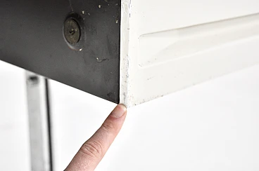 Wooden desk with white metal drawers designed by Trau Arredamenti Metallici S.P.A. No keys. Wear due to time and age of the desk.