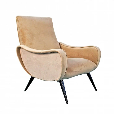 LADY" style single armchair by designer Marco Zanuso. Completely restored recently with a velvet fabric in Beige color and feet in black lacquered wood. 50s design. Vintage object in excellent condition, as in the photo.