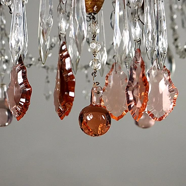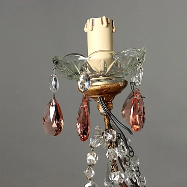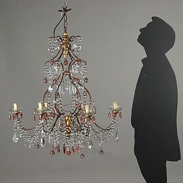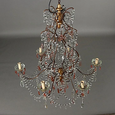 Six-light chandelier with painted metal structure, Italy, early 20th century. Turned terminals in gilded wood; glass bobeches, necklaces and pendants, the latter also present in colored glass. Small shortcomings.