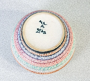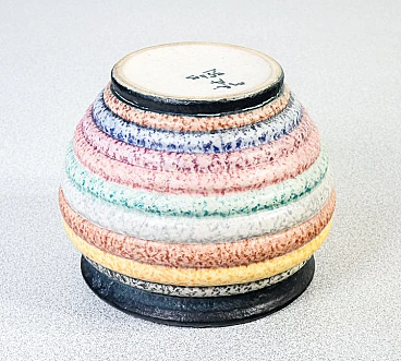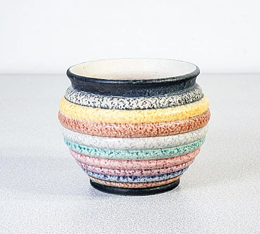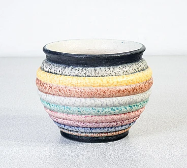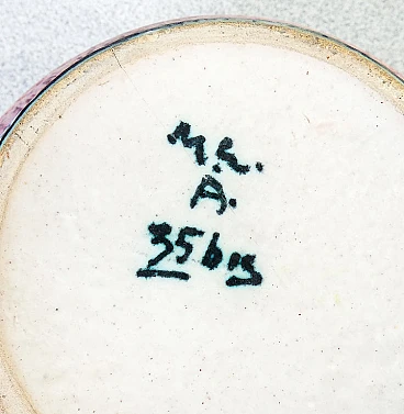 Majolica and decorated terracotta small vase by Nicolaj Diulgheroff for M.G.A. (Mazzotti Giuseppe Albisola), mid-20th century. Nicolaj Diulgheroff (1901-1982) was a Bulgarian artist, architect and designer, active mainly in Italy. He studied in Vienna and at the Bauhaus before moving to Turin in 1926, where he joined the Italian Futurists. Diulgheroff was known for his works of painting, ceramics and graphics, characterized by dynamic shapes and bright colors. He remained in Turin for 56 years, contributing significantly to the futurist movement. He died in 1982 and is remembered as one of the greatest artists of the interwar era. The vase has a repair on one of the sides visible in the photos.