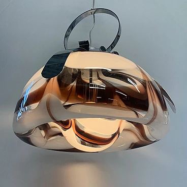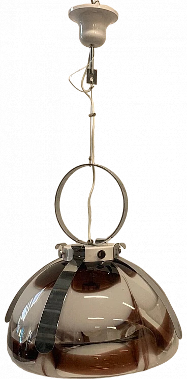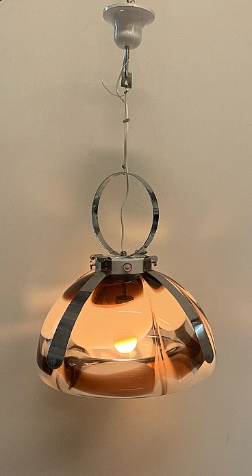 Fantastic and rare chandelier of the 70s, in excellent conditions attributed to the Esperia ... it has the craft card. It is all original, it has very few sign of time, fantastic smoke -colored glass, purple, with chromium structure. The structure is in metal and has the central cable in new steel. New electrical system. It is a rare and very particular piece. The glass is dismantled from the structure. Excellent element that can furnish several rooms: from the kitchen to the room, from entry to the room and bathroom. Led bulb is also recommended. It has a lamp holder E27. The price also includes the restoration; performed by artisans specialized in this profession for over 30 years. We recommend withdrawal by hand, but for the shipment there is no problem, we make a reinforced structure included in the shipping price, write to us for more information.